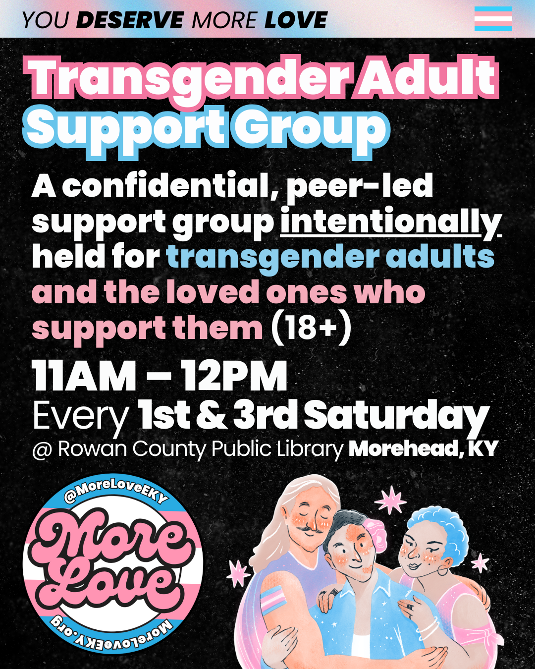 A confidential, peer-led support group intentionally held for transgender adults and the loved ones who support them (18+). Morehead, KY.